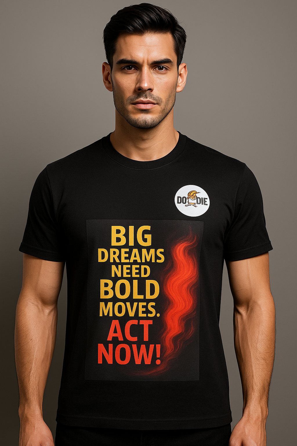 No dream ever came true sitting still. This high-impact tee is for the relentless action-takers. Featuring the fiery command: “BIG DREAMS NEED BOLD MOVES. ACT NOW!”, it’s a rally cry wrapped in soft black cotton. From The Do or Die Company, this shirt speaks louder than excuses and burns with urgency.